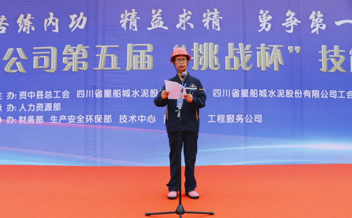 參賽選手代表袁理宣讀倡議書,要做技術(shù)“好漢”、“硬漢”和“癡漢”,不斷汲取新技術(shù),練就新技能,敢于技術(shù)創(chuàng)新,力求技術(shù)突破,奮力為川威水泥可持續(xù)發(fā)展奉獻(xiàn)力量。